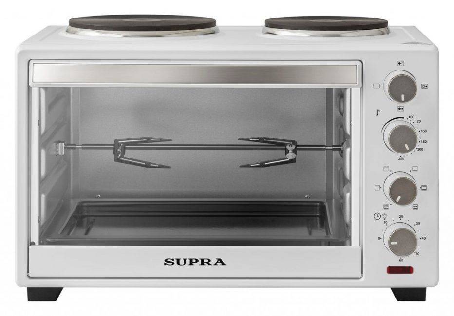 Вместительная для своей категории модель мини-печи, SUPRA MTS-324 рассчитана на мощность 1600 Вт. Её отличительная черта – встроенная электрическая плитка на крышке с двумя чугунными варочными конфорками мощностью 1000 Вт (левая) и 600 Вт (правая).
