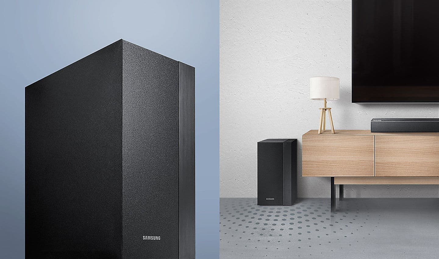 Многие звуковые панели включают в свой состав сабвуфер, который обладает беспроводным подключением к остальной системе. Поскольку человеческое восприятие низкочастотного звука не сильно зависит от расположения динамика, можно поставить сабвуфер сзади, рядом или под диваном, и значительно улучшить звук.