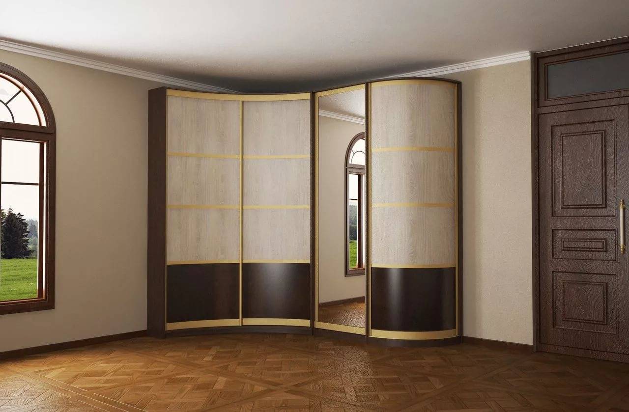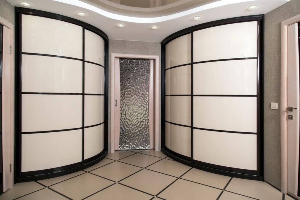 Оригинальный вид радиального корпуса. Эти конструкции относительно новые, но они уже пользуются большим спросом, так как позволяют реализовать самые смелые дизайнерские идеи. Уникальный фасад скрывает острые углы, делает архитектуру помещения более «мягкой». Такой модный гардероб станет ярким акцентом любого помещения.