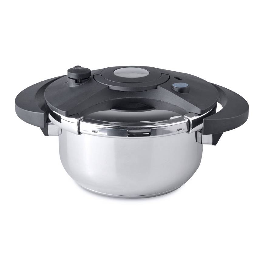Удобная и визуально приятная модель из нержавеющей стали. Чаша с двойным дном отличается повышенной прочностью и оснащена ручками с термостойким покрытием. Крышка полностью съёмная и имеет надёжную систему фиксации, которая защищает от случайного открытия. Производитель предусмотрел аварийный клапан, который поможет нормализовать давление в случае возникновения проблем. Плотную посадку крышки обеспечивает силиконовое кольцо, запасной элемент входит в базовую комплектацию.