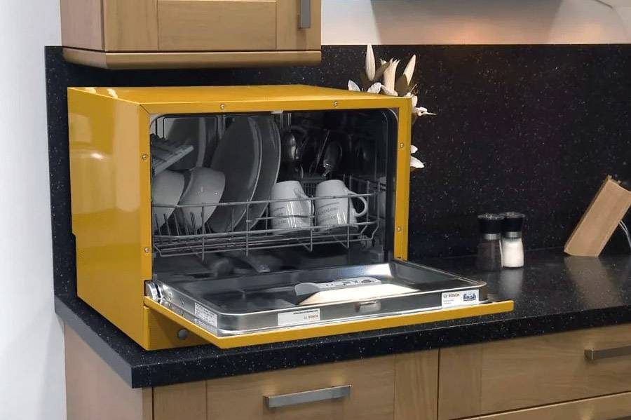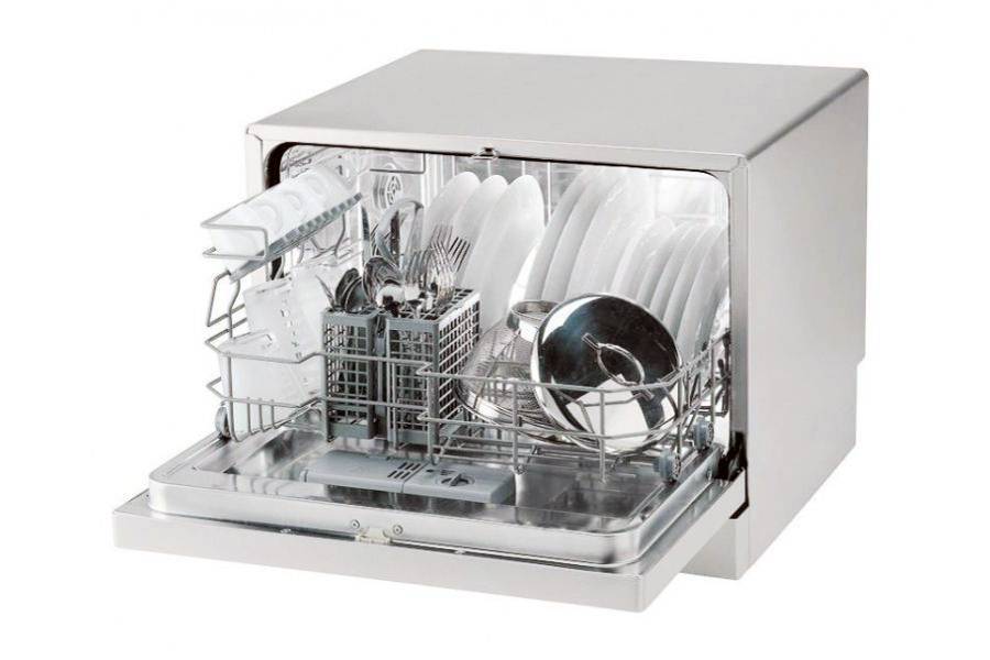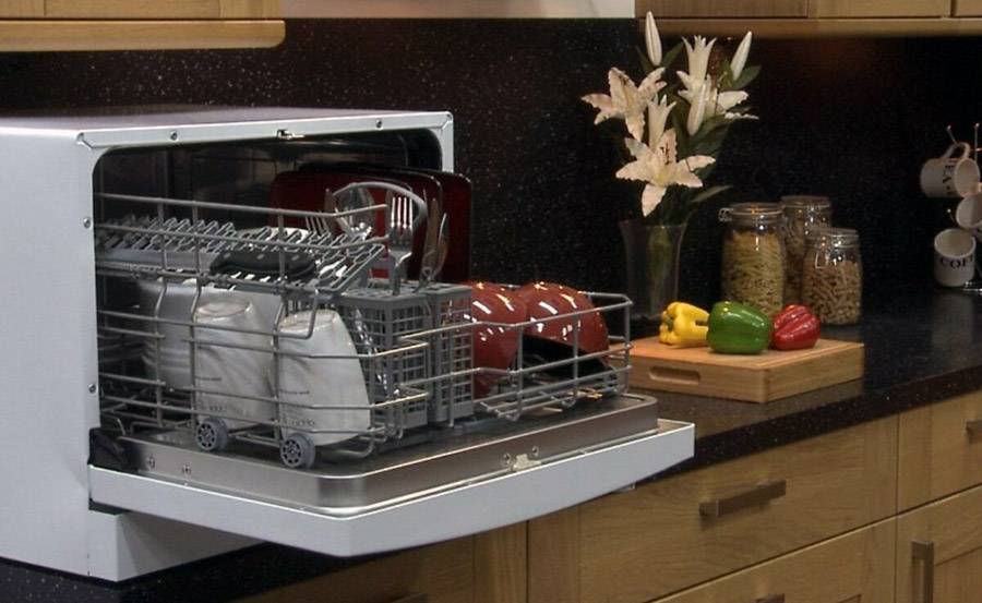 - Маленькие портативные посудомойки высотой до 50 см вмещают всего 4-6 комплектов посуды.