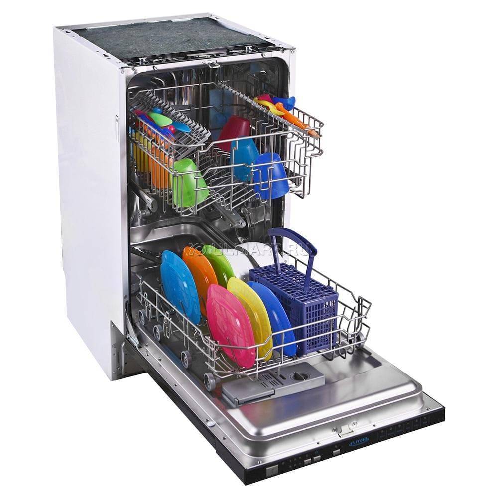- Узкие посудомоечные машины шириной 45 см вмещают 10-11 комплектов посуды.