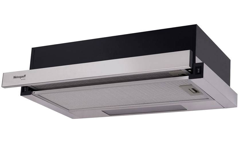 Это своего рода аналог встроенных вариантов, с той лишь разницей, что рабочая поверхность выезжает за пределы кухонного гарнитура. Также встречаются телескопические наклонные вытяжки. Оборудование такого плана предлагает завидную эргономичность, но, как и в случае с другой встроенной техникой, страдает мощность.
