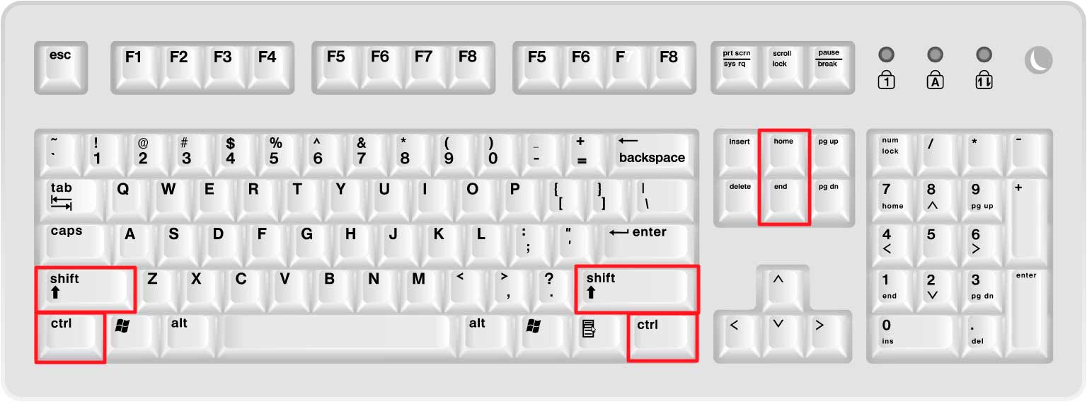 Если же вам нужно выделить не все файлы в папки, а только некоторые из них, то для этого можно использовать клавиши CTRL, ПРОБЕЛ и стрелки. Расположение этих клавиш на клавиатуре отмечено на картинке внизу.