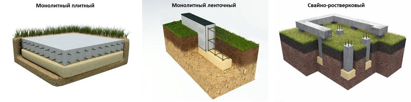 • Монолитные, сборные или сборно-монолитные конструкции. В большинстве случаев такой фундамент заливается непосредственно на месте, но иногда функции основании выполняет цельное ж/б изделие заводского качества или сборные конструкции из плит перекрытий.