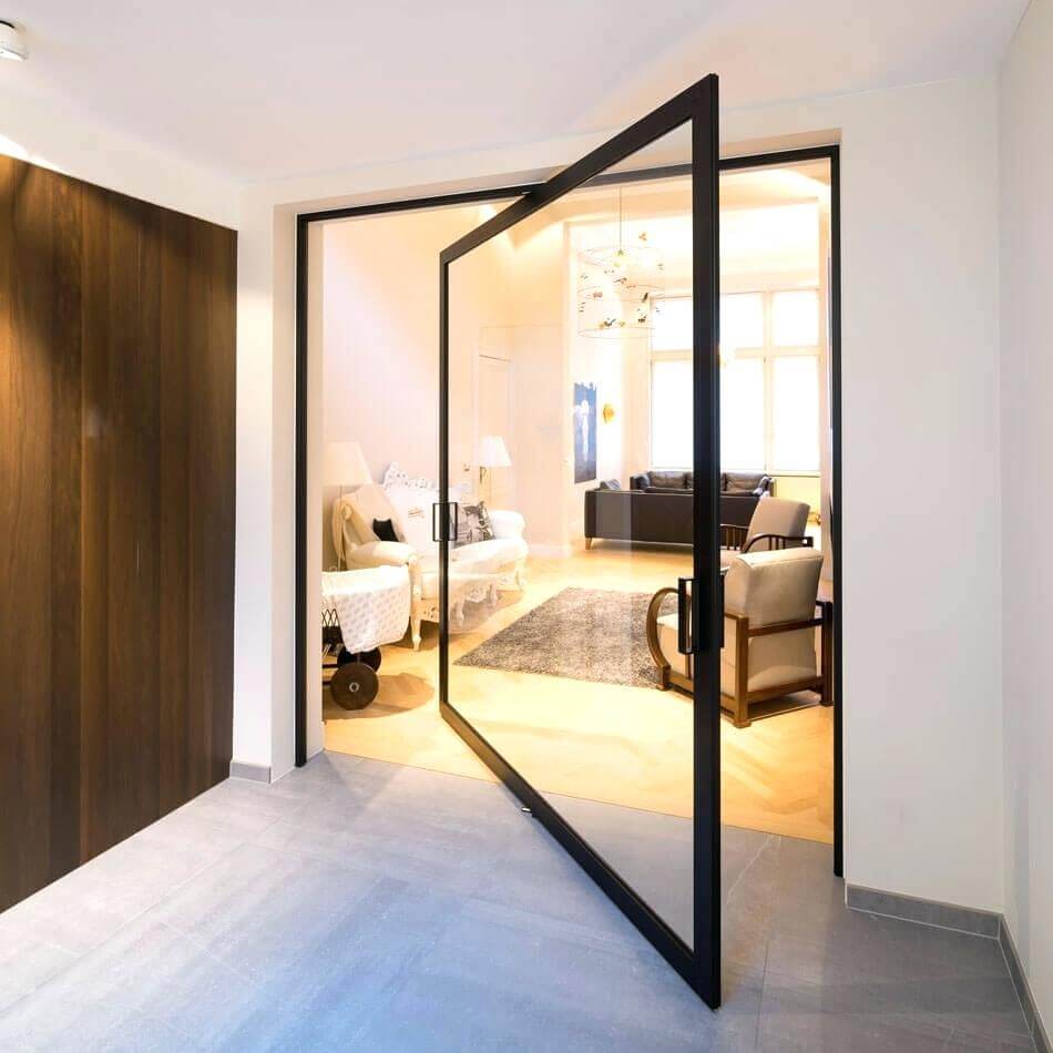 Маятниковые. Классические распашные двери, которые оснащаются специальными сложными поворотными петлями на пружинных механизмах. Полотна могут открываться в любую сторону – как в помещение, так и наружу.