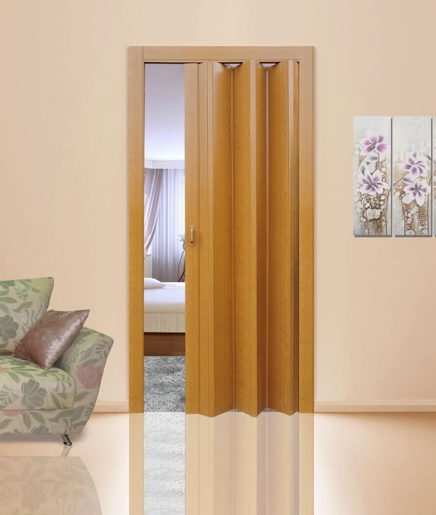 Двери такой конструкции выглядят в виде своеобразной гармошки, которая состоит из соединённых друг с другом створок. В процессе закрывания они поворачиваются по определённой вертикальной оси, а в сложенном приложении плотно прилегают друг к другу. Это нечто среднее между распашными и раздвижными типами дверей.