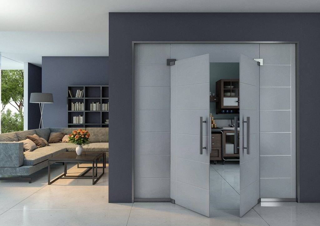 Маятниковые двери – механизм конструкции позволять открываться им внутрь и наружу. При установке дверь крепится к стене и полу, потому как не имеет дверной коробки.