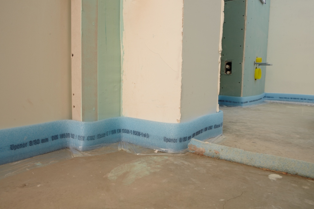 Обязательно слой изоляции наносится по периметру помещения на стены на высоту 5-7 см.