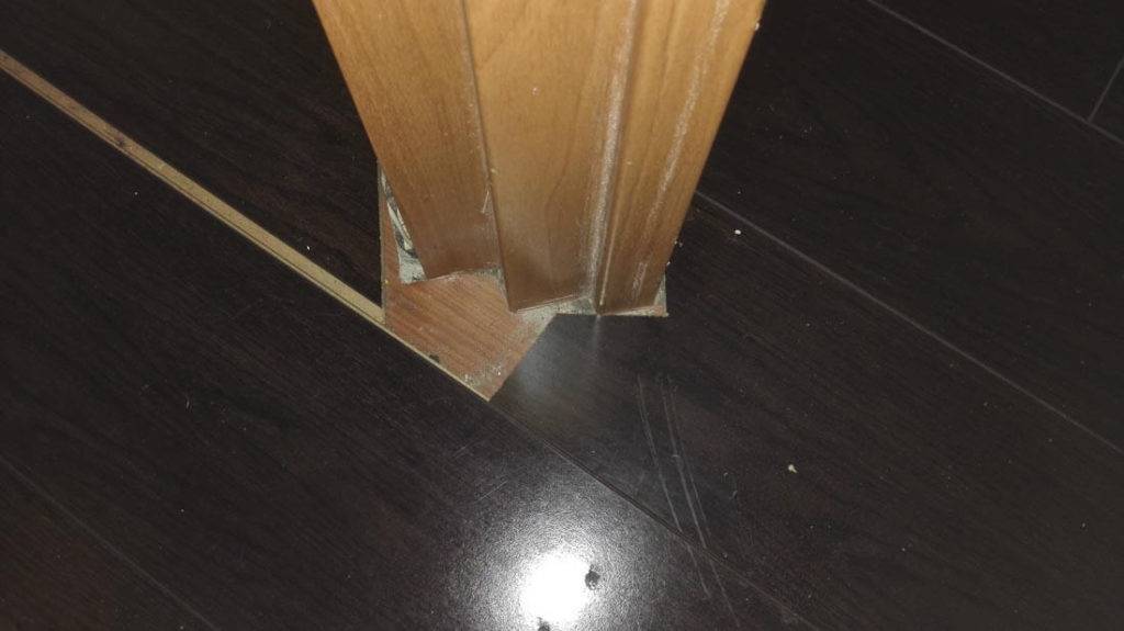- Иногда заказчики жаловались, что ламинат черного цвета разошелся. Обычно, при осмотре, оказывалось что мастера просто не забили планку ламината в предыдущий ряд. По своей работе замечал, некоторые марки ламината с фаской темного цвета при малом освещении не всегда видно, до конца вставил планку в замок или нет.