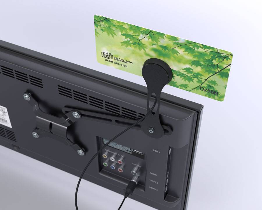 Комнатные антенны могут быть пассивными или активными. Встроенный усилитель поможет принять сигнал через бетонную стену. Питание на электронную схему подается от отдельного блока или прямо от DVB-T2 приставки, в последнем случае надо включить опцию в настройках.
