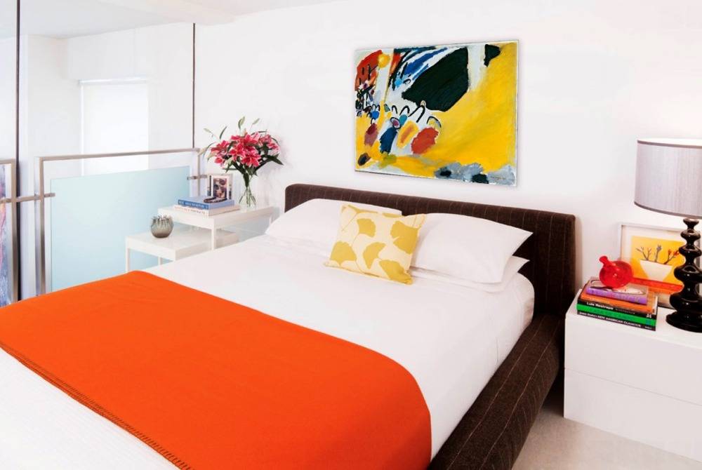 Если спальня небольшая, не стоит вешать слишком большую или слишком маленькую картину. Лучше выбрать полотно средней величины, которое будет прекрасно гармонировать с размерами помещения и его дизайном. Хорошо сочетаются контрастные яркие цвета картины с такой же палитрой постельного белья.