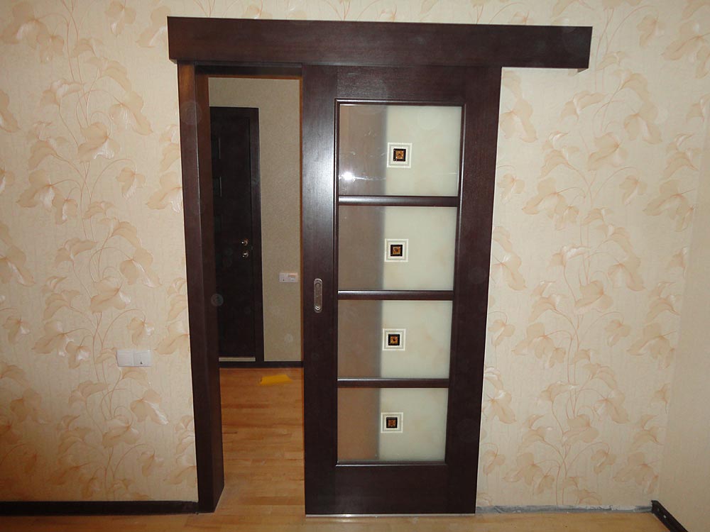 Сборку любой раздвижной системы начинают с крепления верхнего опорного профиля. Обычно при выполнении этой операции проблемы не возникают. Для установки в большинстве случаев требуется закрепить на стене, над дверным проемом, дополнительный брус. Для одностворчатой — его минимальная длина должна равняться двойной ширине проема. Если в жилом помещении устанавливаются двухстворчатые межкомнатные двери, то длина бруса должна быть равной четырёхкратной ширине проема.
