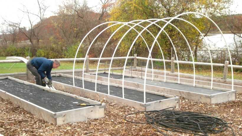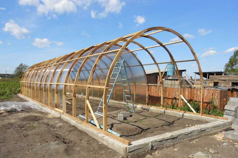 Каркас делается из металлоконструкций, древесины или пластика. А в качестве укрывного материала используется полиэтилен, поликарбонат или стекло