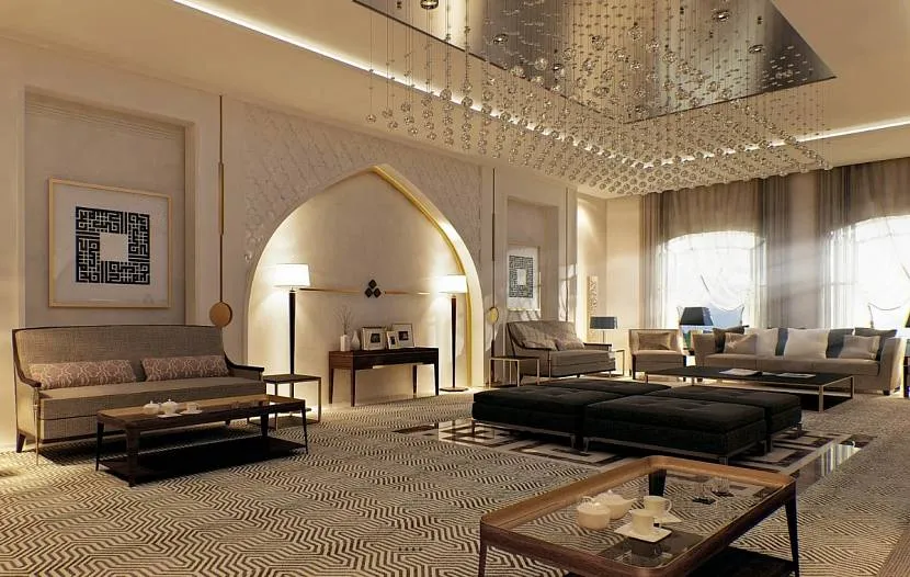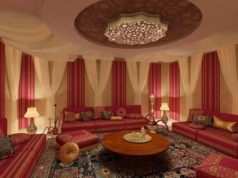 Для арабского направления характерно обилие текстиля во всём: интерьер украшают роскошные ковры, на диванах множество подушек, вместо перегородок, а также для украшения стен используют ткань.