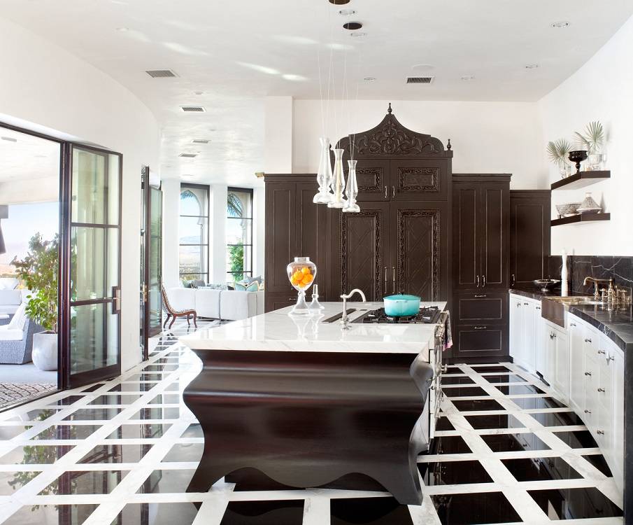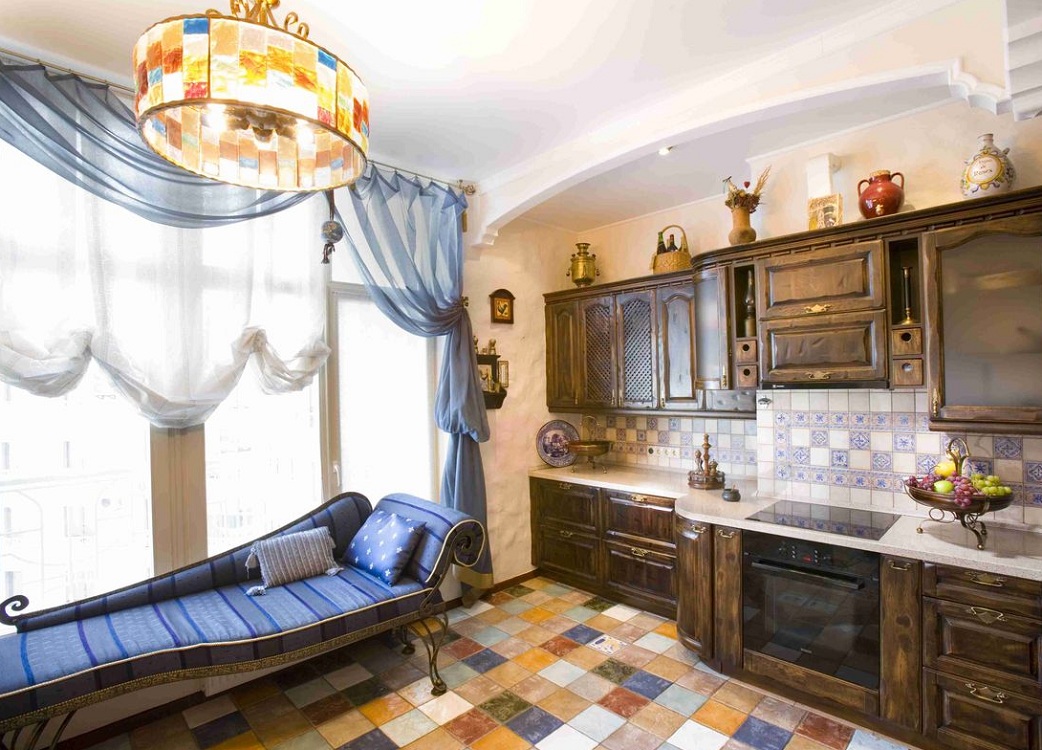 На радость практичной хозяйке, в восточном стиле часто используется керамическая плитка. Из нее выкладываются узоры и орнаменты, она является главным материалом и одновременно украшением стен. Керамическое покрытие легко мыть, оно не портится от влажности, высокой температуры и солнечных лучей. Такой материал не выходит из моды в оформлении кухонь.
