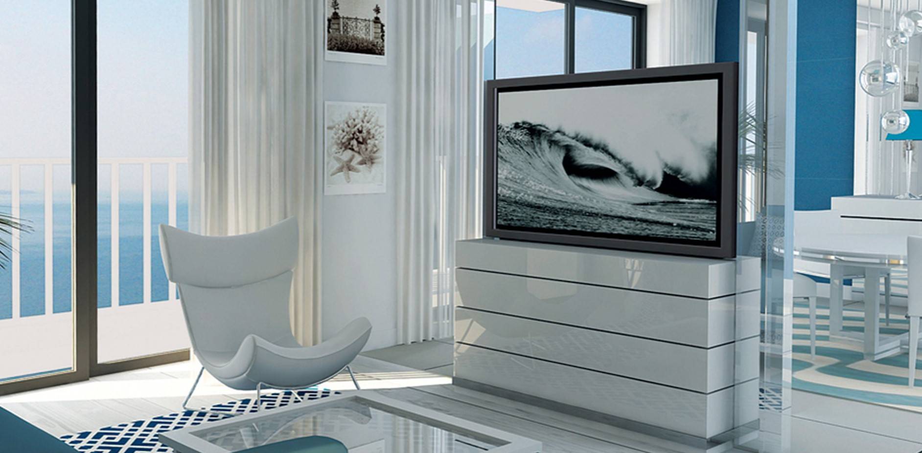 Ручек на ящиках нет — здесь работает скрытый механизм со стопорами. Это удобно и стильно. Такая мебель служит полноценным декором помещения и отлично сочетается с яркими элементами обстановки.