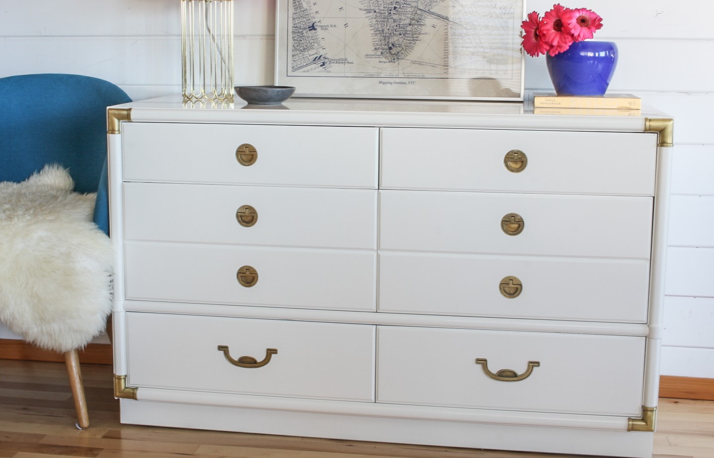 Розовый комод в белой комнате может стать акцентным элементом