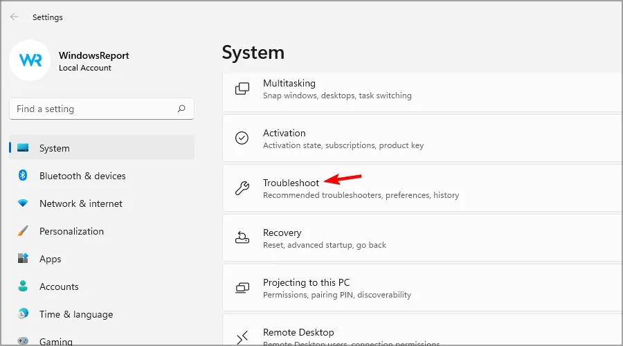 Выберите «Система», затем нажмите «Устранение неполадок».