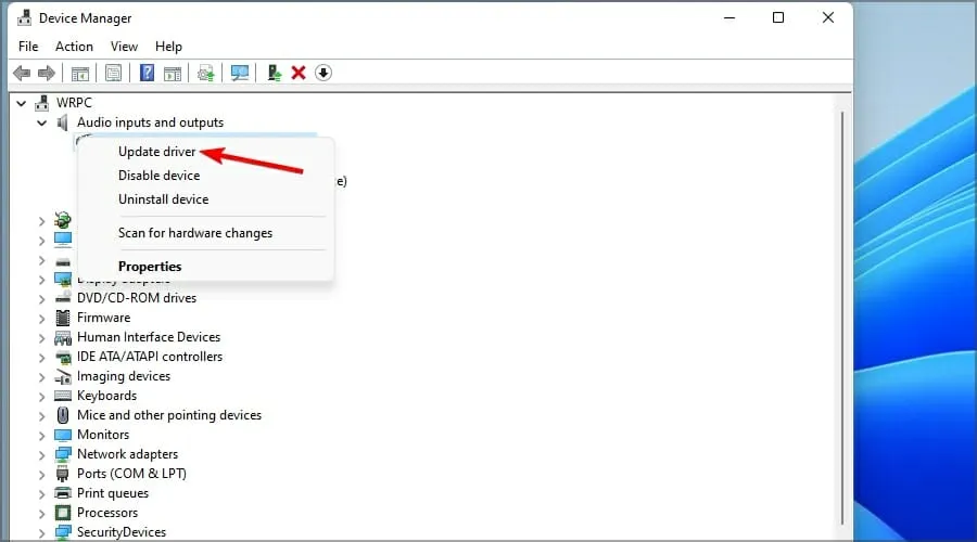 Разверните Аудиовходы и выходы, затем щелкните правой кнопкой мыши наушники и выберите Обновить драйвер.