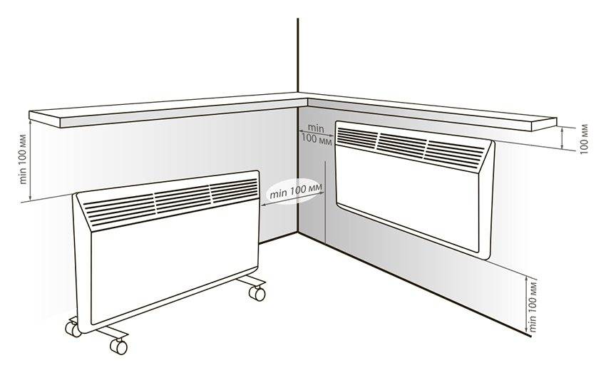 Расстояние между верхней кромкой конвектора и любыми предметами не должно превышать 45 см. Во всех конвекторах действует система пожаробезопасности, и если верхняя щель окажется случайно чем-то закрыта, сработает автоматика и устройство просто выключится. Поэтому нельзя сушить на обогреватели вещи, накрывать его чем-либо или ставить высокий конвектор под окно.