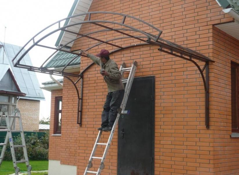 Чтобы козырек над крыльцом к дому был надежным и долго радовал глаз, конструкцию изготавливают по всем правилам строительной науки: