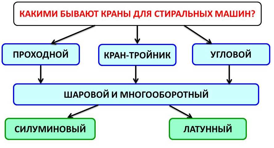 Если не использовать тройник для подключения стиральной машины, то какие еще краны потенциально подойдут для подключения бытовой техники к водопроводу? В зависимости от положения и количества выводов краны для стиральных машин делятся на: проходные (проточные), краны-тройники, угловые краны.