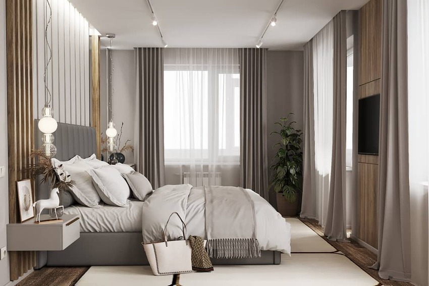 Чаще всего дизайн спальни выполняют в светлых нейтральных тонах: белый, серый, бежевый. Количество оттенков каждого из этих цветов позволяет создать даже на 100% монохромный дизайн, но он все равно не будет выглядеть скучно.