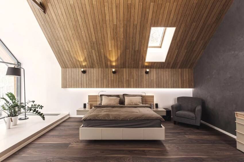 Такой современный потолок с фактурой дерева отлично впишется в эко-дизайн, лофт, рустик, минимализм.