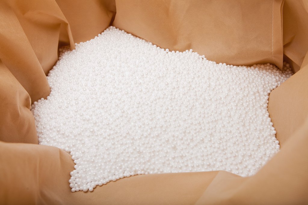Пенопласт для набивки производится в виде небольших шариков. Материал легкий, бюджетный, отличается небольшой усадкой, комфортной, мягкой фактурой, плотностью. Форма шариков пенопласта долго сохраняется, но при длительной эксплуатации увеличивается жесткость состава. Рекомендуется добавлять в материал поролоновую крошку либо холлофайбер.