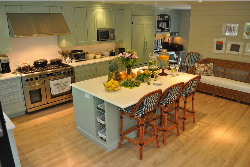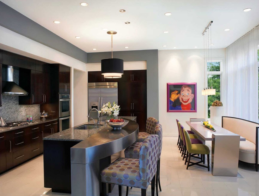 Сложность оборудования кухни-столовой состоит в том, что пространство надо не только правильно разделить на зоны, но и сохранить при этом единство пространства. Для достижения каждой из целей существует несколько приемов.