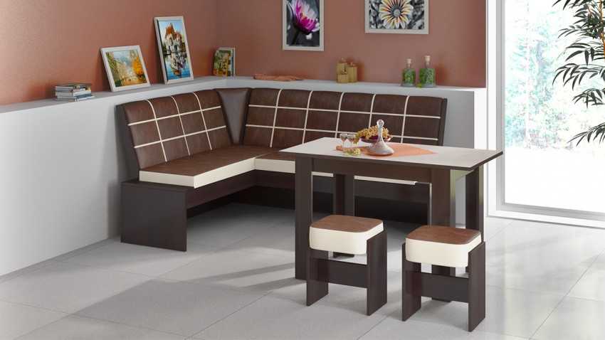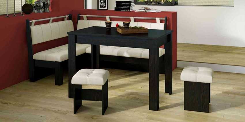 Мини-диван для кухни углового типа является распространенным решением, которое имеет множество плюсов. Дополняется такой элемент мебели столом и стульями. При желании можно приобрести модель, реализующуюся вместе с мягкими пуфиками.