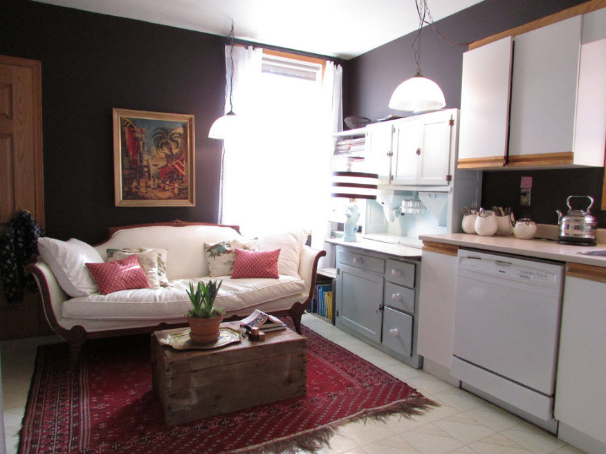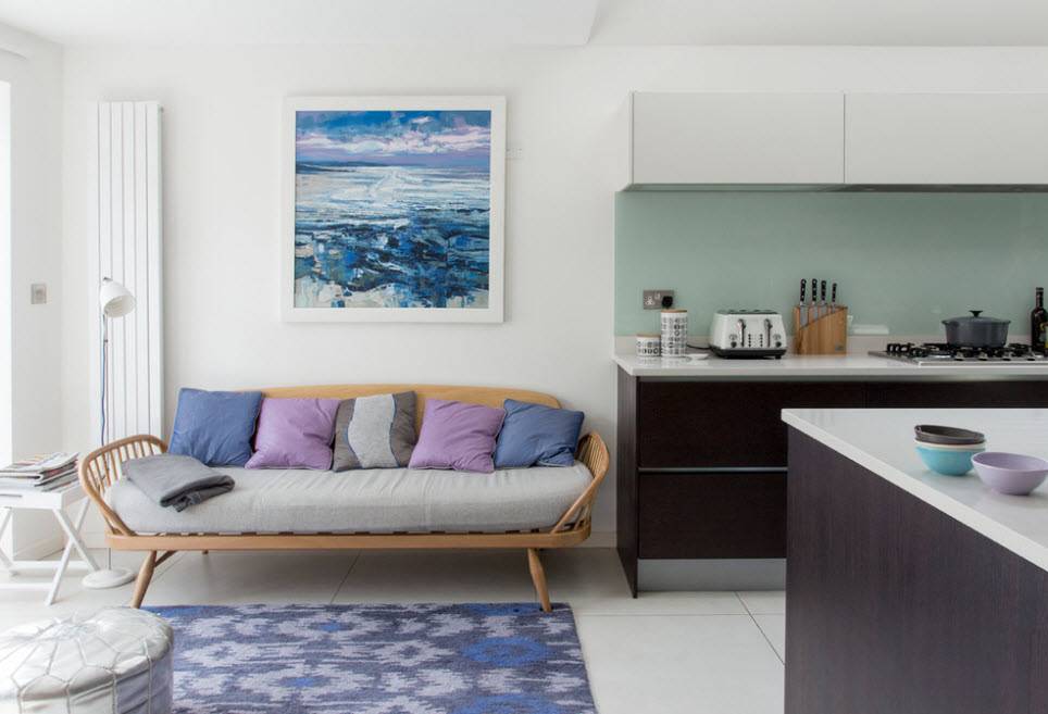 - Разделение с помощью дивана объединенных помещений на кухонную и гостиную зоны.