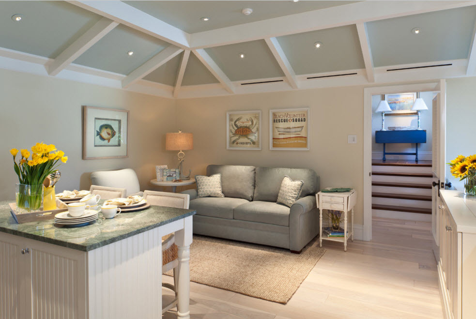 При помощи подвесного потолка с разными уровнями также можно визуально отделять одну зону от другой. Например, на кухне создается потолок более низкий, чем в гостиной. При этом для освещения рабочей зоны могут использоваться софиты, а обеденной – подвесные светильники. Какую именно часть потолка делать ниже, прежде всего, зависит от высоты помещения и того, насколько потолок ровный.