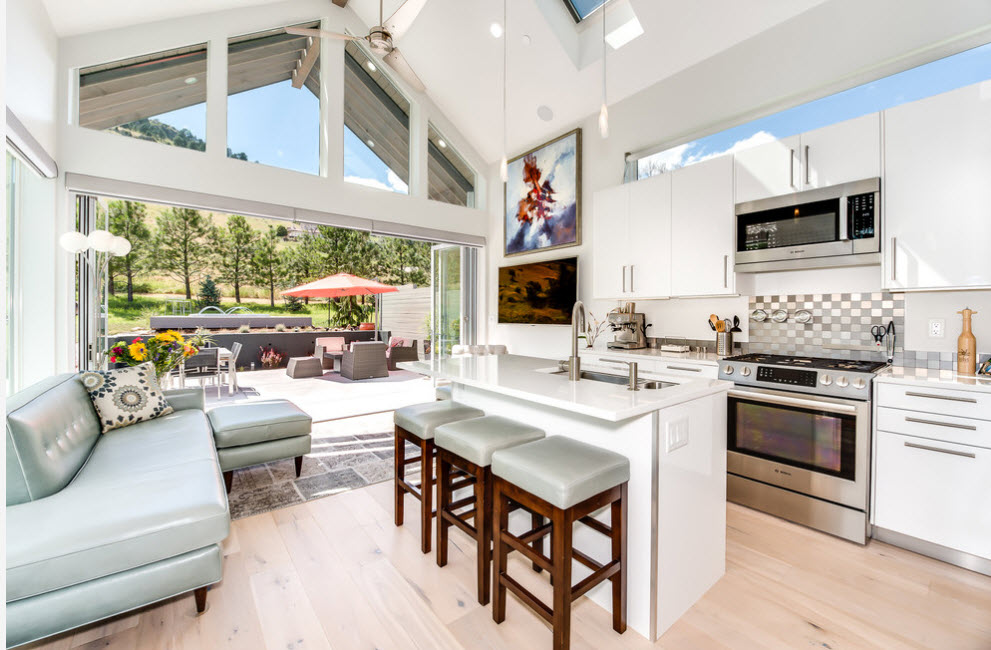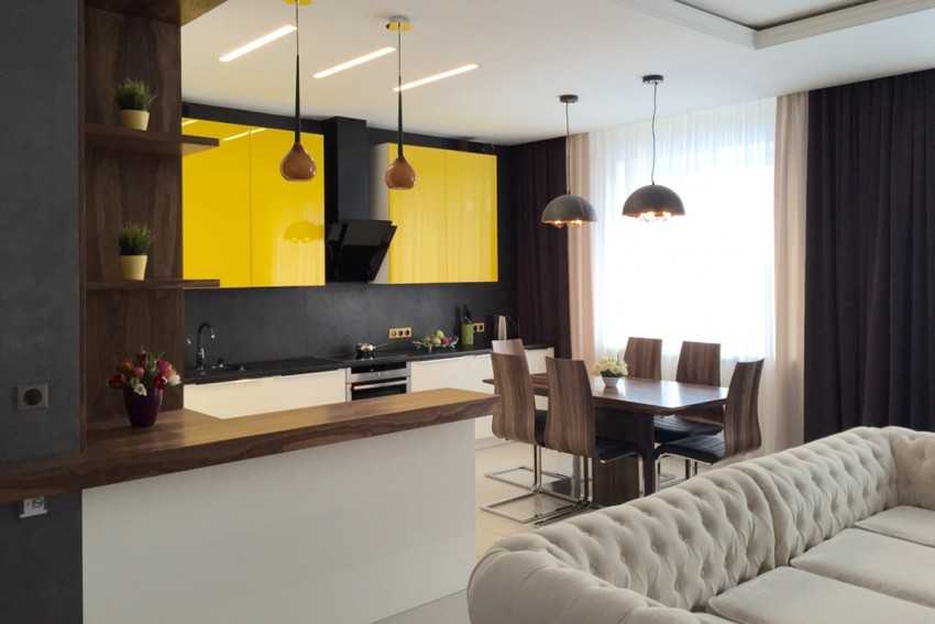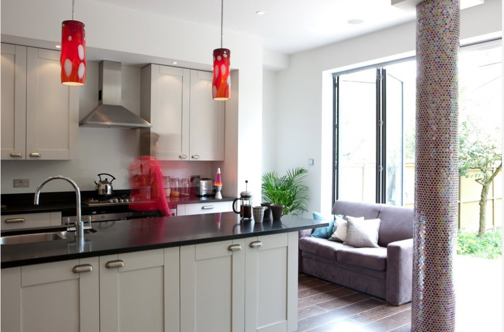 Такой вариант разделения подразумевает сразу несколько вариантов. Можно соорудить барную стойку. Многие кухонные гарнитуры включают отдельностоящий остров, который также может размежевать площадь. В качестве еще одного варианта дизайнеры предлагают возвести декоративную перегородку из гипсокартона с нишами или полками для размещения предметов декора, книг и других мелочей. Не стоит забывать и про диван в гостиной, который также может отделять ее от кухни.