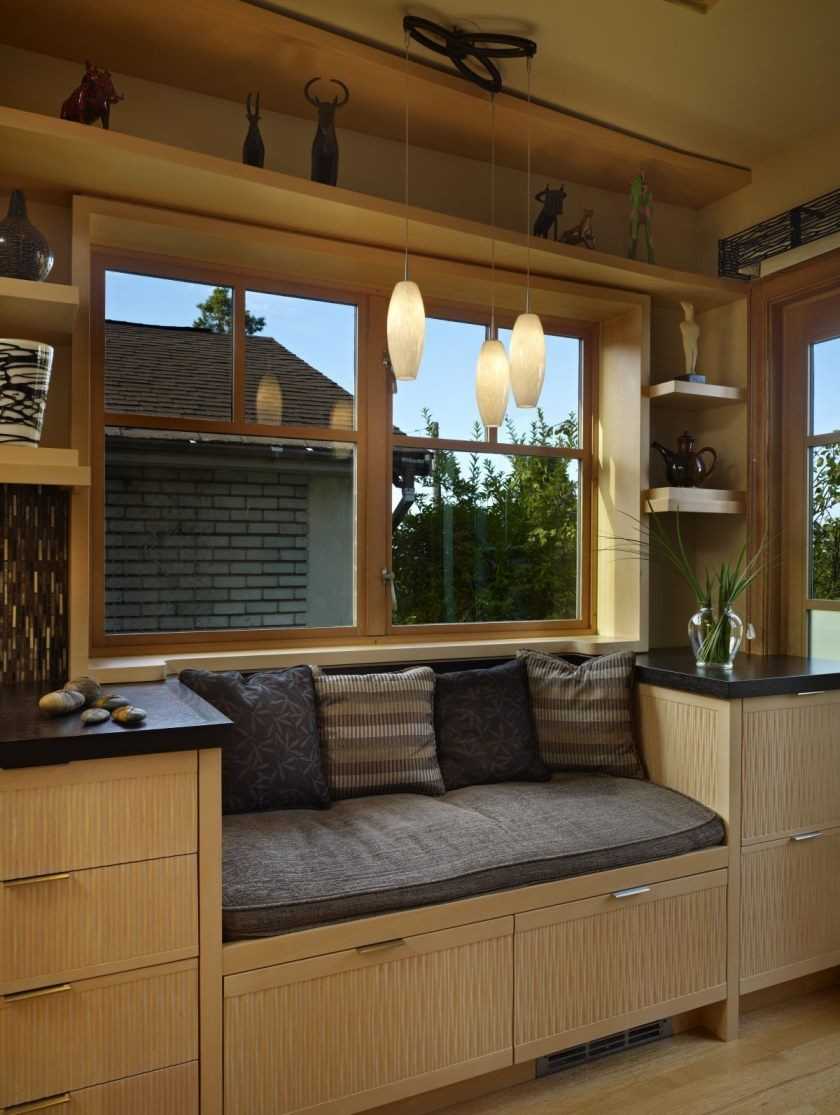 - У окна. Ставят небольшие конструкции или эркерный диван.