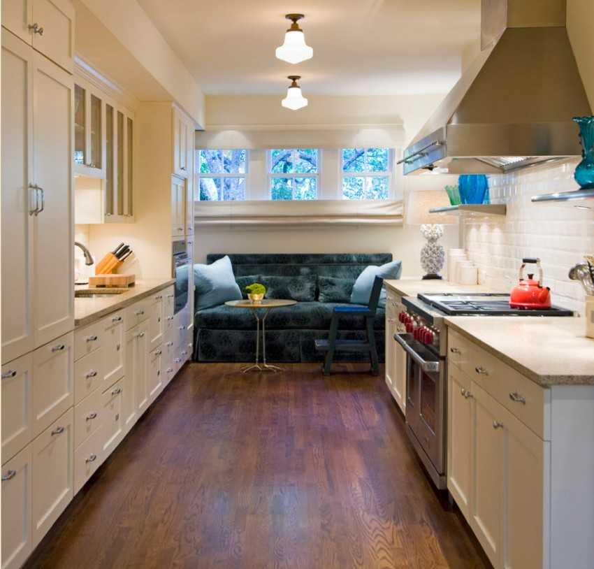 - Метод параллельной расстановки кухонной мебели: диван располагается на противоположной от рабочей зоны стены, а между ними устанавливается стол;