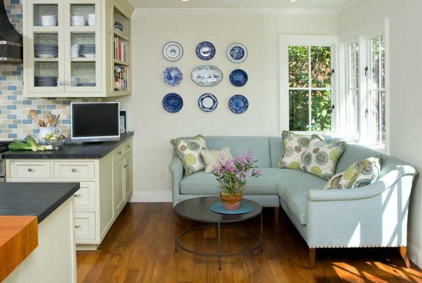 Устанавливать угловой диван лучше в кухне, которая не менее 14 кв. метров. В противном случае следует ограничиться небольшим прямым диванчиком или вовсе отказаться от такой идеи.