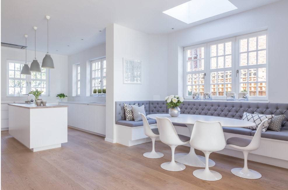 Безусловно, самый популярный способ установки дивана в кухонном пространстве – использование этого предмета интерьера в качестве составляющей обеденной зоны. Уровень комфорта за обеденным столом повышается существенно. На мягком диване и семейные ужины становятся приятнее и неспешные посиделки с друзьями проходят в более теплой и радушной атмосфере