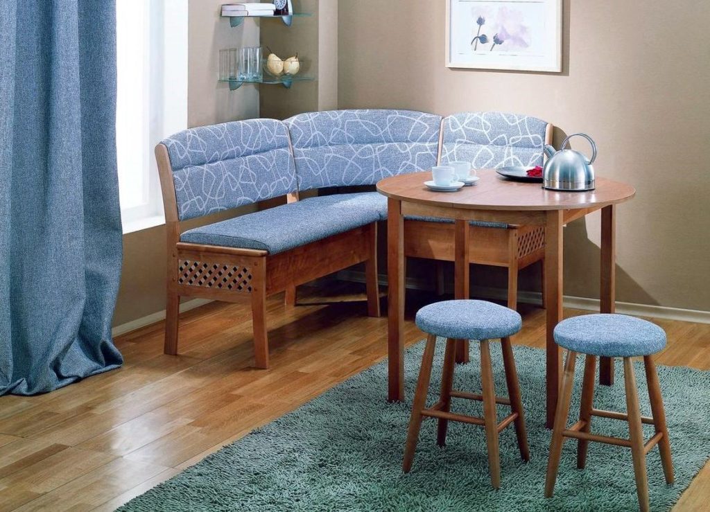 Мини-диван для кухни углового типа является распространенным решением, которое имеет множество плюсов. Дополняется такой элемент мебели столом и стульями. При желании можно приобрести модель, реализующуюся вместе с мягкими пуфиками.