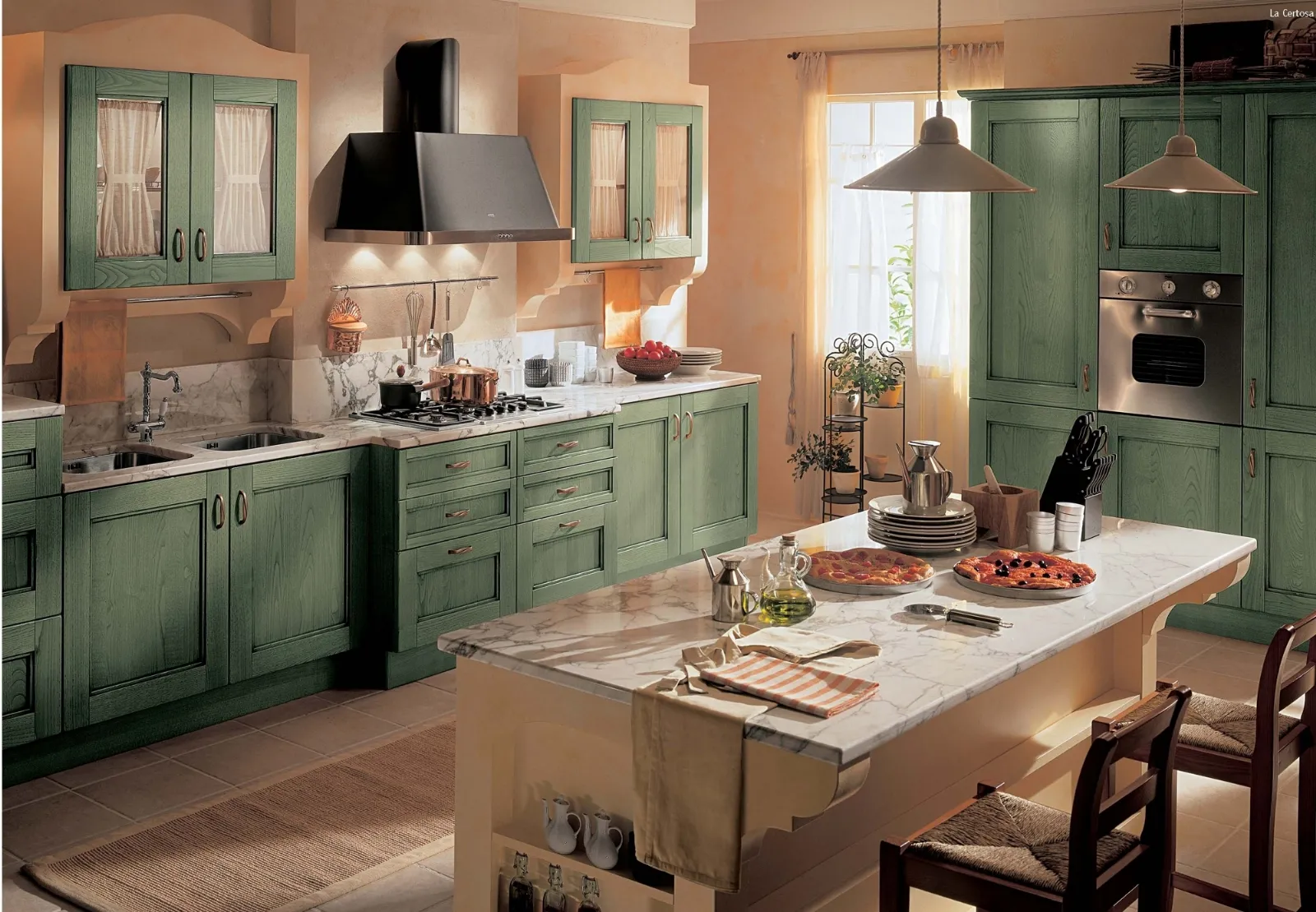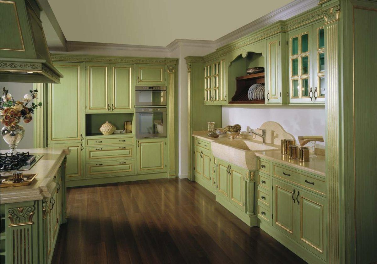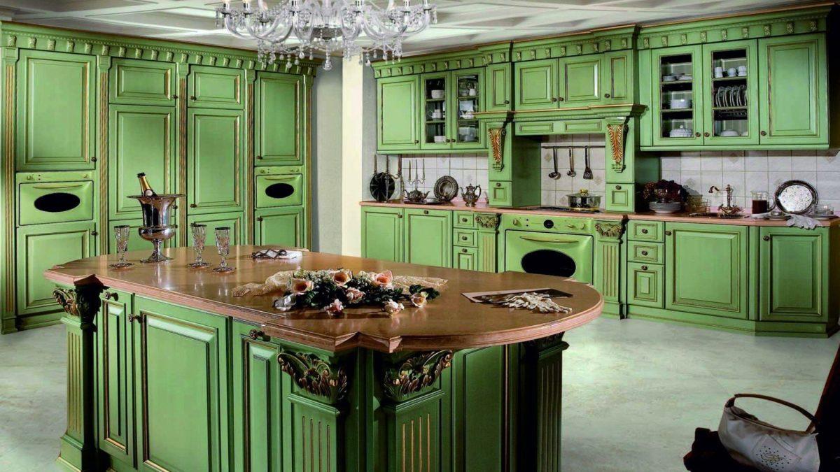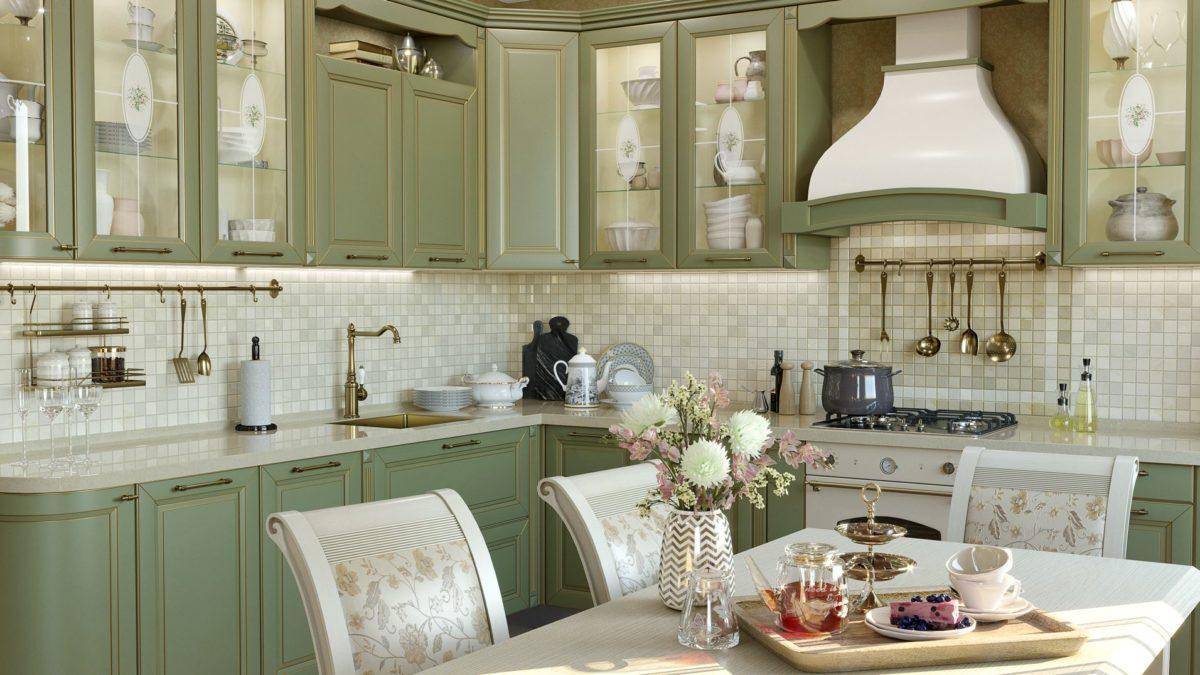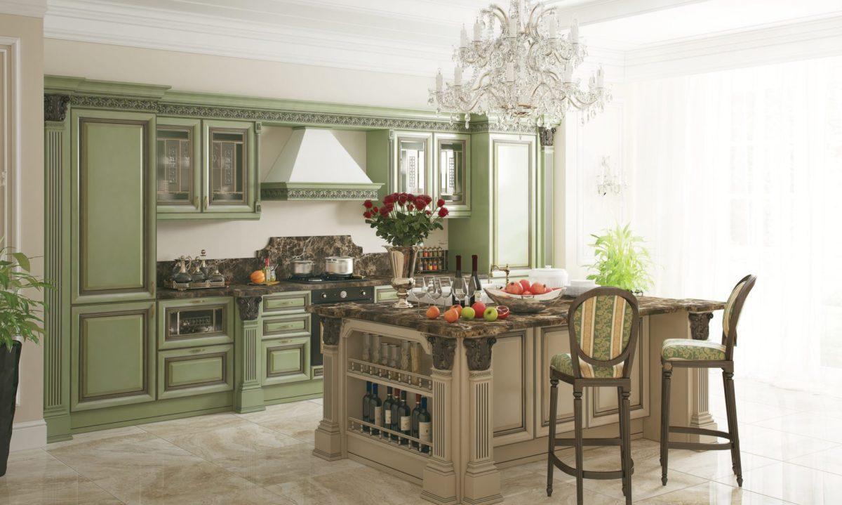 Однако лучше всего оливковый подходит для классических и минималистических стилей. Он добавляет кухне элегантности и утончённости. Витиеватые мотивы классической лепнины безупречно сочетаются со светлыми оливковыми тоннами. А добавление этого цвета в резную и ажурную мебель — секрет превосходства.