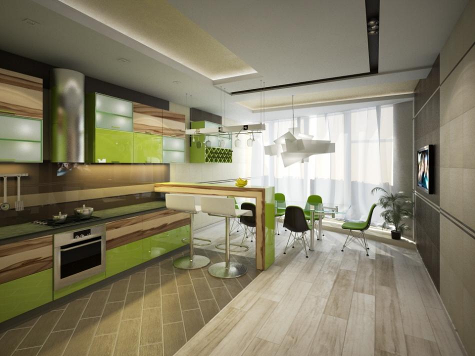 Экостиль как никакой другой подходит для такого интерьера. Натуральные мотивы эффектно переплетаются с нежностью оливковых оттенков. Их дуэт создаёт мягкое сочетание уюта и простора на кухне.