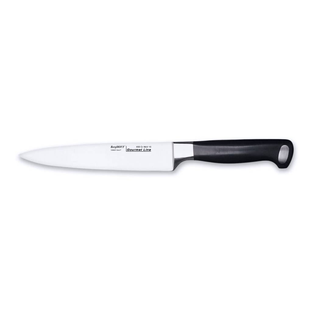 Бельгийский производитель славится своими режущими инструментами. Кухонный нож для разделки BergHOFF Gourmet Line 1399607 выгодно отличается от конкурентов кованым клинком из хром-молибден-ванадиевой стали. Нержавейка закалена по особой технологии с применением льда. Высокая твердость сочетается с пластичностью, что делает нож прочным и долговечным. Острота режущей кромки сохраняется длительное время, позволяя быстро разделывать любые сорта мяса. При длине лезвия 18 см удается работать с большими кусками.