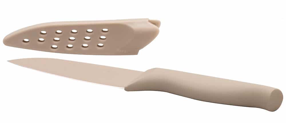 Дешевизна обусловлена материалом, из которого изготовлено лезвие. На самом деле, нож стальной с керамическим покрытием, но это напыление дает инструменту все свойства керамического клинка. Инструмент легко моется, долго остается острым, не имеет пор. Он довольно мал, чтобы быть универсальным, поэтому идеально подойдет для чистки овощей и фруктов.