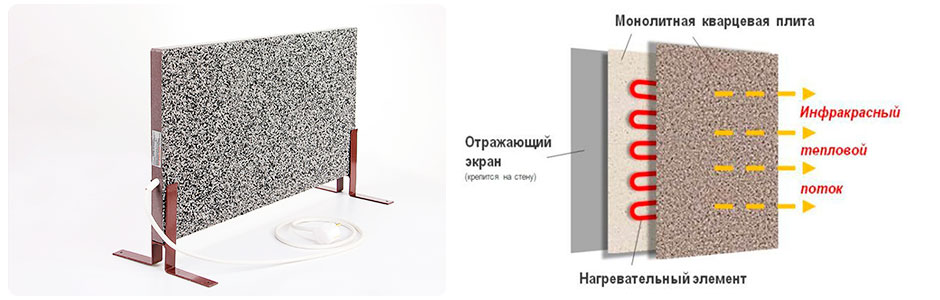 Под определение «кварцевый обогреватель» попадает много обогревательных приборов, в том числе и тепловые пушки со встроенными блоками из минеральных элементов, сохраняющих тепло. Но это все проделки маркетологов, пытающихся эксплуатировать популярность классических кварцевых обогревательных приборов, представляющих собой монолитную плиту со встроенным вовнутрь нагревательным элементом.