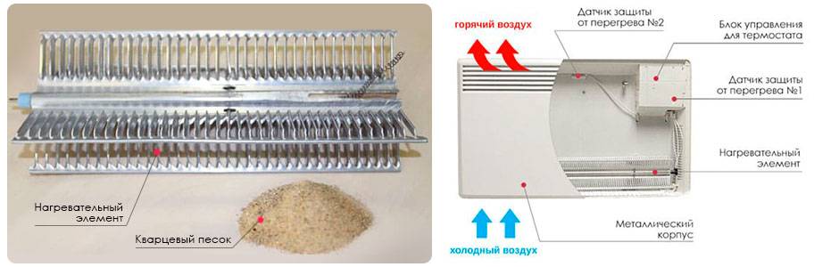 Конвекторы практически всех производителей имеют схожий нагревательный элемент, в основе которого нить накаливания. Это может быть вольфрамовая нить (самая долговечная и эффективная с точки зрения получения тепла), нихромовая (более дешёвая, менее долговечная и результативная) или стальная (самая простая, громоздкая и имеющая минимальный срок службы).