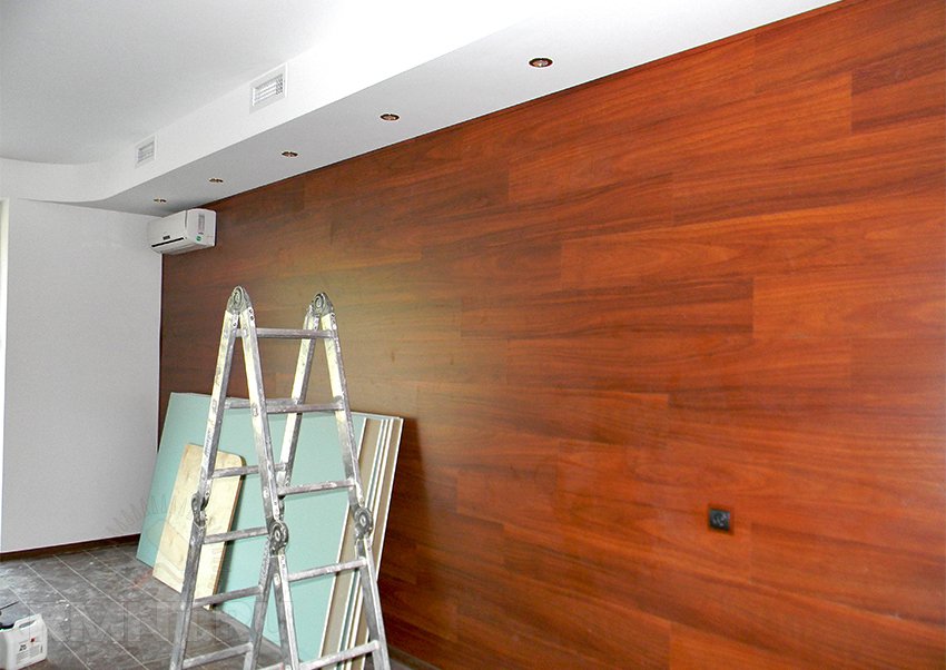 Стена из гипсокартона должна быть очищена от пыли и прогрунтована. Ламинат нужно перебрать и сортировать по рисунку.