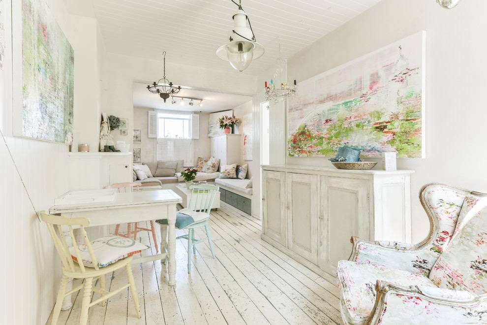 Прованс, шебби-шик притягивают текстуры ламината с элементами имитации «состарившейся» доски, такие как винтажная сосна, дуб старый белый (патина). Деревянная мебель либо оттенков белого цвета, светлое напольное покрытие, текстильное оформление с флористической тематикой, обои пастельных тонов — идеальное сочетание для домашней стилистики.