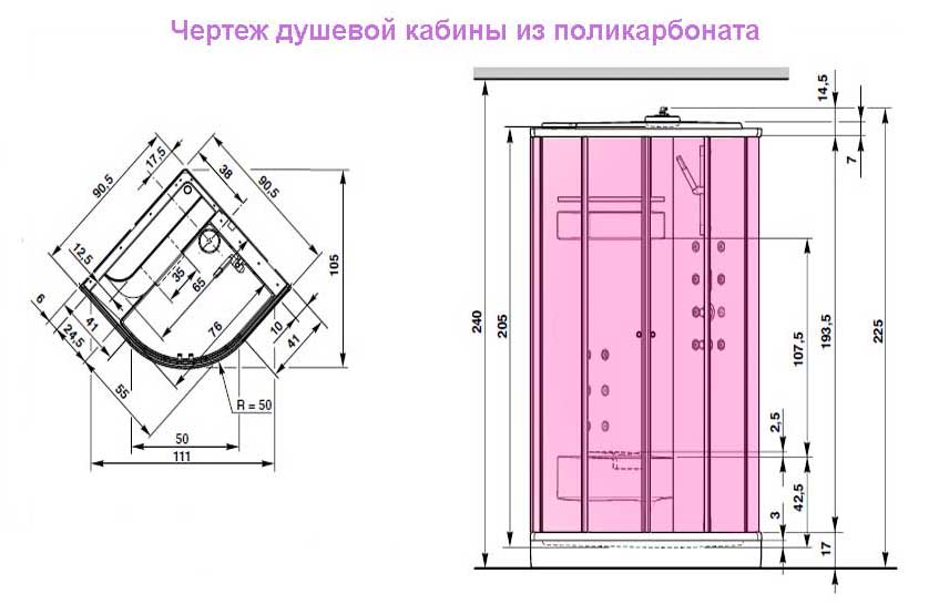 Габариты кабины. Определяющим фактором является размер поддона. Его рекомендуется покупать готовый. Стандартные размеры — от 90*70 до 170*90 см