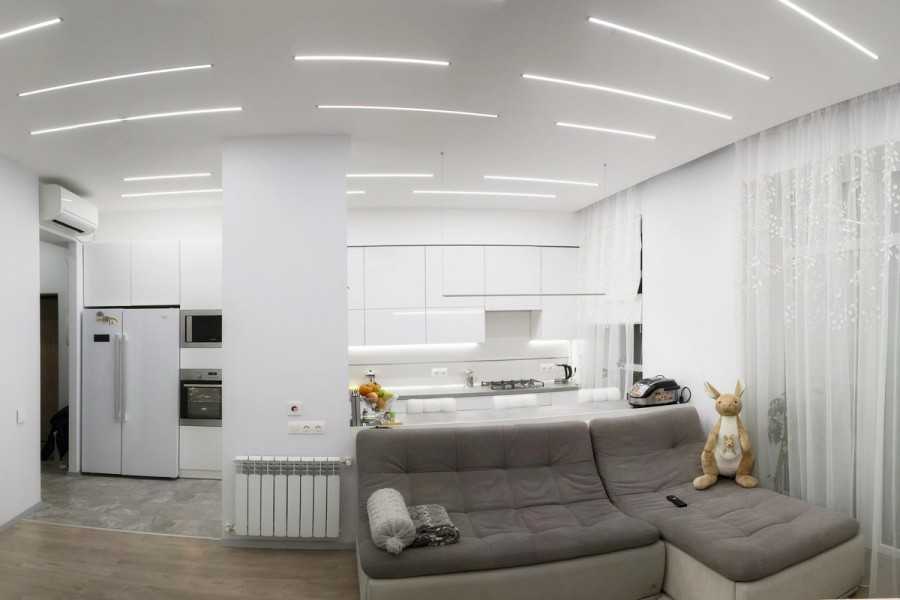 С помощью встраиваемых линейных светильников можно решать любые задачи как основного, так и дополнительного освещения. Классический тип с применением люстры как основного источника света плох тем, что создает световое пятно в центре комнаты, недостаточно сильно затрагивая ее углы и отдаленные участки.